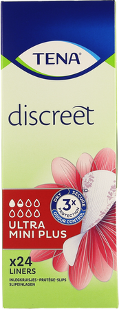 TENA Discreet Ultra Mini-inlegkruisjes zijn er voor wanneer u last hebt van licht urineverlies of soms enkele druppels verliest. De inlegkruisjes zijn ultradun en super absorberend, zo bent u verzekerd van een beschermd en discreet gevoel. Hetzelfde formaat als normale inlegkruisjes, maar veel absorberender dankzij microPROTEX™-technologie dat vocht snel opsluit. De dunne en veilige inlegkruisjes houden vocht en ongewenste geurtjes direct vast, en geven u de hele dag door een fris gevoel.